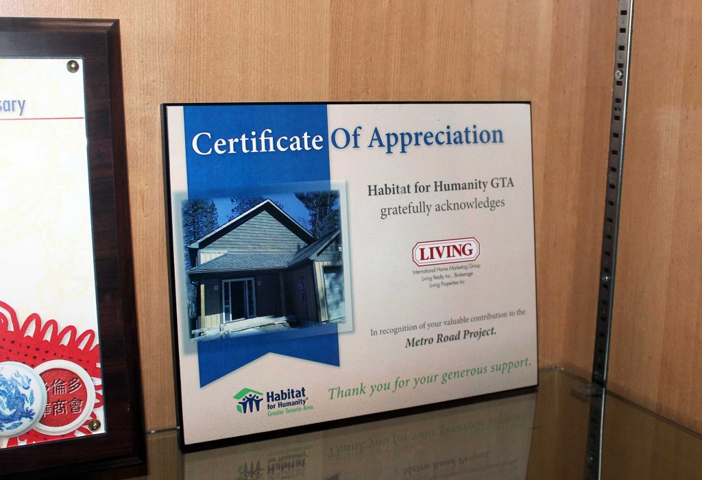 The fundraising campaign, which was launched to help celebrate the Group’s new head office location at 8 Steelcase Road West in Markham, culminated in a corporate contribution of $10,000. On October 7, 2014, the gift was presented personally to representatives from Habitat for Humanity by Living Group of Companies chairman Stephen Wong.