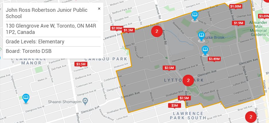 When viewing listings on the map, users will notice bright blue map markers with a white book icon in the middle, which denote public schools in the Greater Toronto Area. When a user clicks on a school icon, details of the school appear including the name, address, grade level and school board. At the same time, a box will appear on the map to show the school boundary for that school.