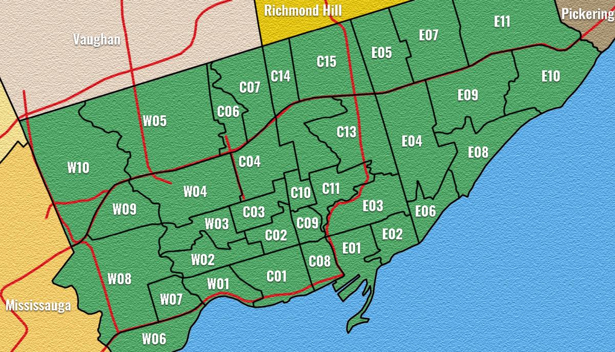 A trend also seems to appear when focusing on the locations of home sales. Looking at the October year-over-year sales numbers, Durham Region (42.3%), Halton Region (48.9%), Peel Region (34%), and York Region (36.2%) all saw big increases in sales, while the City of Toronto only rose 6.6%. Focusing more closely at Toronto, the TRREB data splits the city into three regions – west, central and east – and these had notably different results. While Toronto West (15.2%) and Toronto East (10.6%) saw year-over-year increases in sales, Toronto Central saw a 0.8% decrease. This was mostly caused by three specific TRREB-defined areas: Toronto C01, Toronto C14 and Toronto C15 (see locations in the map below). These three areas have some of the highest concentrations of high-rise condominiums in the city, so it is another indication that buyers are focusing more on low-rise homes.